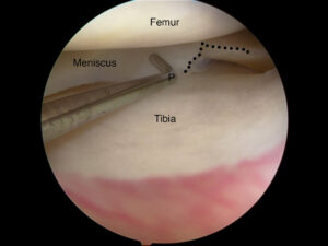 Arthroscopic view of knee showing a meniscal tear.