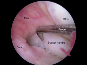 Arthroscopic view of knee with radial meniscal tear.