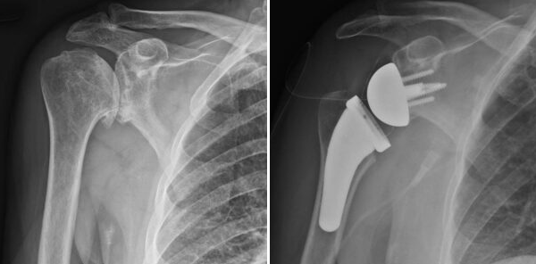 X-rays showing advanced arthritis of shoulder and postoperative picture after a reverse shoulder replacement.